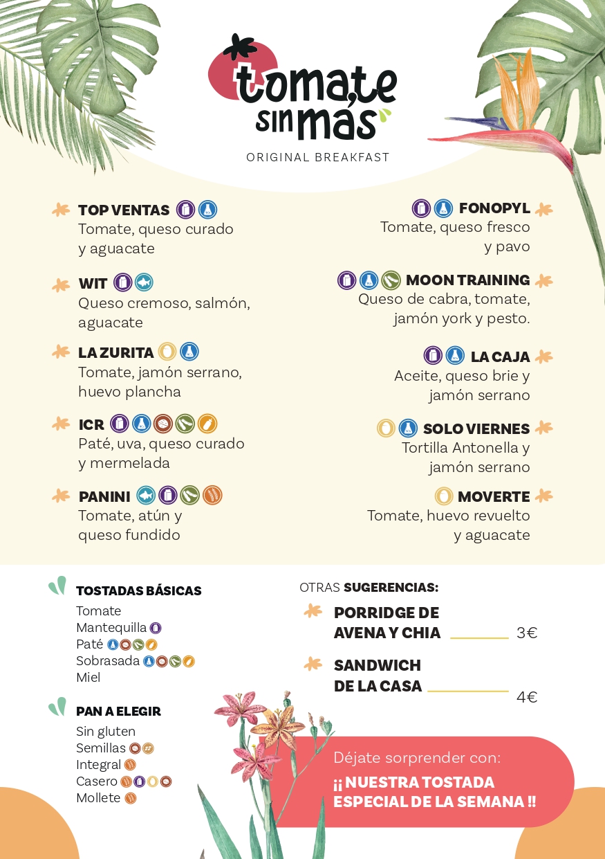 En Tomate Sin Más, nuestra propuesta es en honor a vosotros: producto fresco, combinaciones que funcionan y mucho cariño. Ya busques un chute de energía rápido o un desayuno lento para disfrutar, aquí tienes nuestra selección de tostadas originales, boles y café de especialidad.